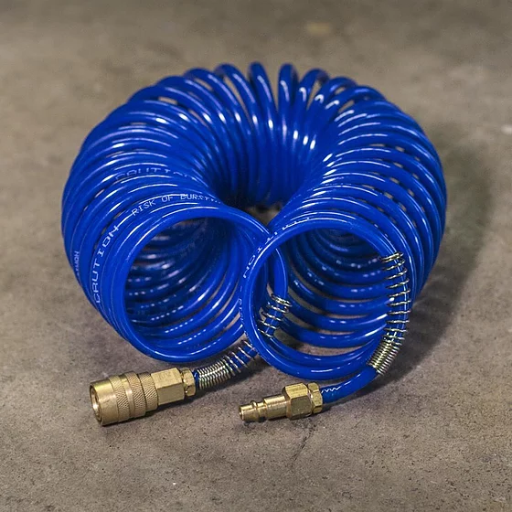 These coiled air hoses can resist most chemicals and are used to carry compressed air to pneumatic tools and equipment on industrial job sites.